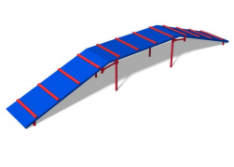Dog Walk 2 is a large raised dog park platform that’s consistent with dog agility training tools. Our element is made of a series of three steel planks: an ascending plank, a plank parallel to the ground and a descending plank. The planks are coated in CanineCoat™, a thermoplastic coating that makes the equipment easy for animal paws to grip while also protecting it from color-fading UV-rays and urine. Perfect for training or for lots of play, the Dog Walk is great for dogs of all breeds and agility levels. Playing, walking, or running across the raised dog park platform will help build pups’ balance and confidence. Our dog park equipment is made in the USA to withstand heavy use and outdoor environments.